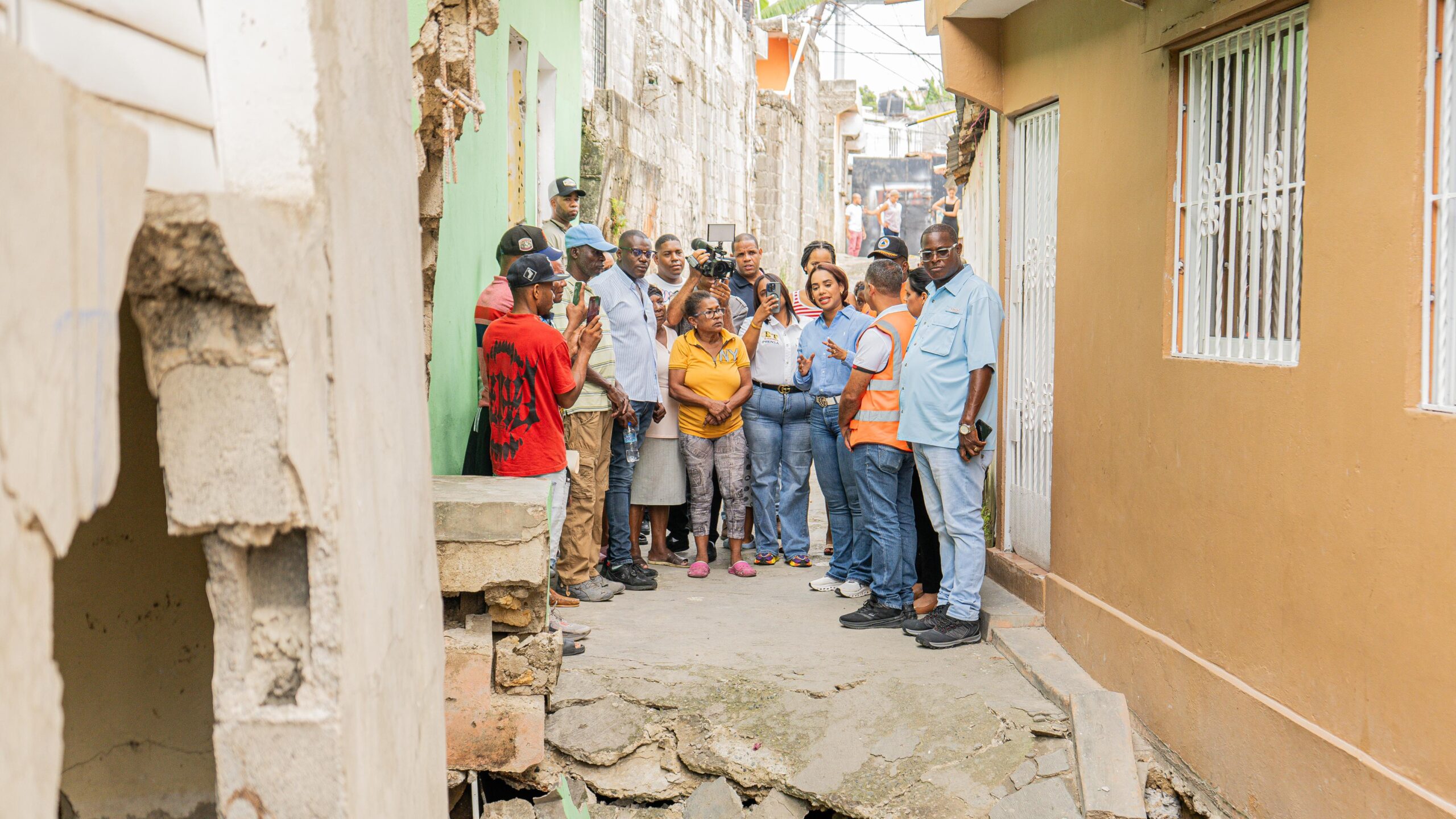Santo Domingo Norte, R.D.– La alcaldesa de Santo Domingo Norte, Betty Gerónimo, visitó la zona afectada por un derrumbe, en la calle Mauricio Báez, del sector de Guaricanos, que provocó el colapso de la pared de una vivienda y del techo de una cañada, generando pánico entre los moradores.